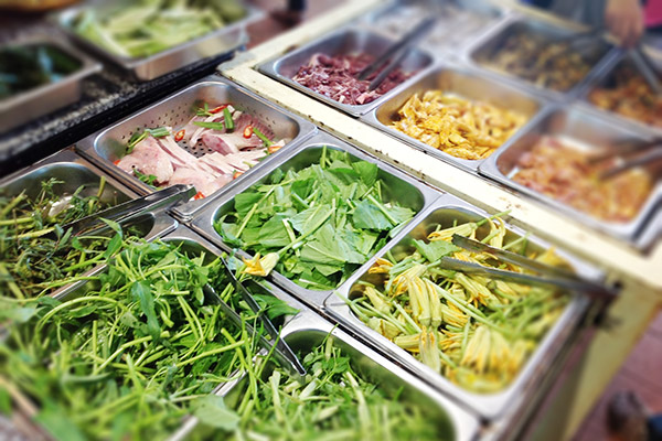入り口にあるボウルとトングを手に、ずらーっと並んだ新鮮な野菜からお好みの野菜を選びます。